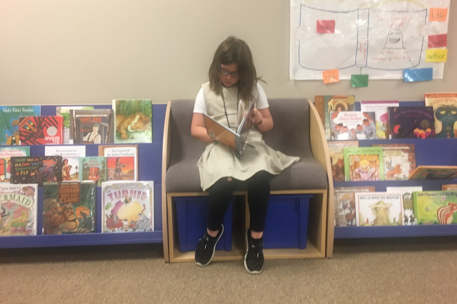 The students wove in and out, exploring of the new bookcases before Katie gathered them all in the new story area. “Raise your hand if you found something new today,” Katie asked. The entire class raised up their hands. “Tell me something new you found,” Katie said and began selecting students to share. “Dogman!”” Descendants!” “Dork Diaries!” “Creepy Carrots!” the students answered. Mrs. Nestberg, surprised, whispered back to the students, “Those are same books we already had! Look at all of the books you found for the first time today!”
