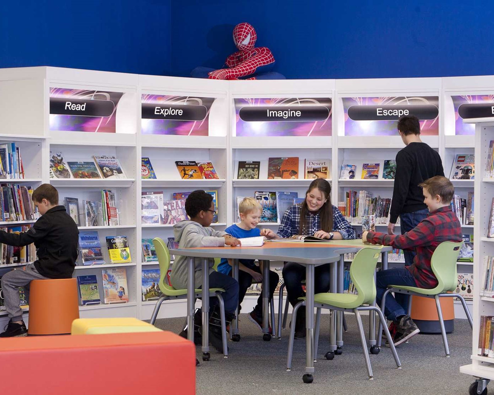 Full of clever retail-style features, Performance shelving is designed to make your books look great. The curved tops enable us to create flowing layouts which draw patrons through the space to explore the collection. Make books really pop with lightboxes that identify each section with high-impact graphics.
